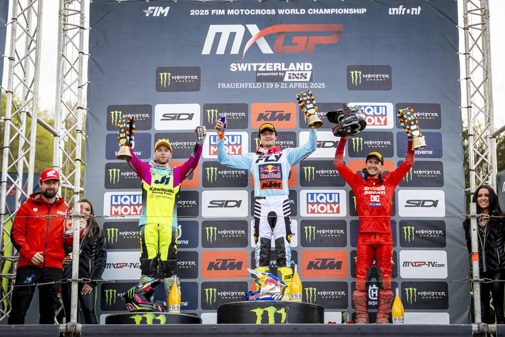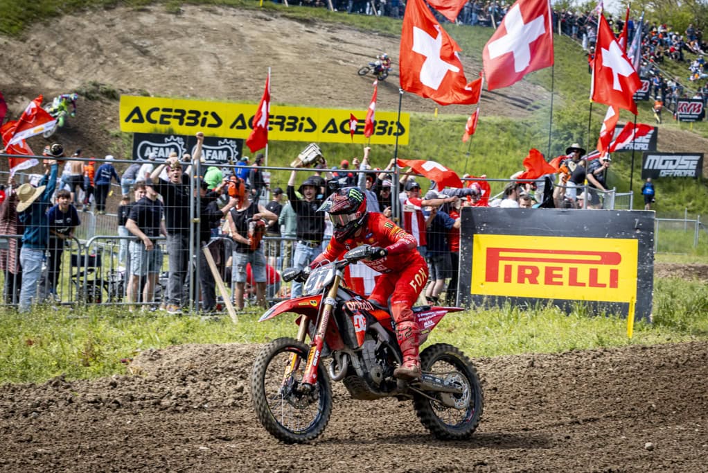 Ondertussen reed Coenen sterk door naar opnieuw een manchewinst en dus zijn eerste GP-zege bij de zware jongens! Achter hem kwam Renaux op de tweede plaats ook keihard ten val, en nam Febvre de tweede plaats over van Herlings die toch erg sterk doorreed. Herlings moest in de laatste ronde thuisrijder Jeremy Seewer nog voorbij laten, maar de vierde plaats was een opsteker voor The Bullet die terugkomt van een langdurige knieblessure.