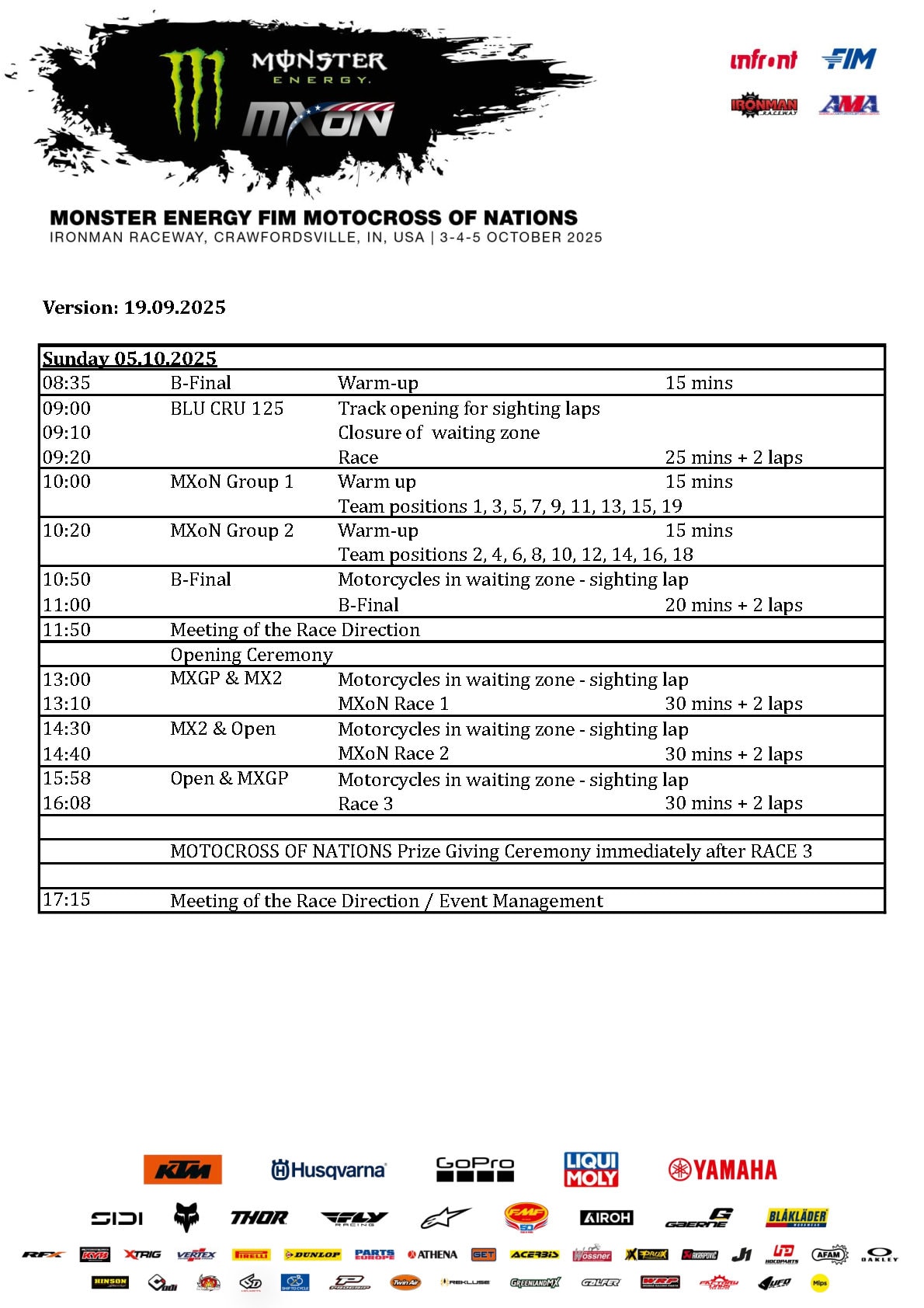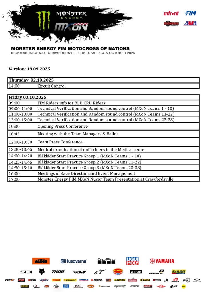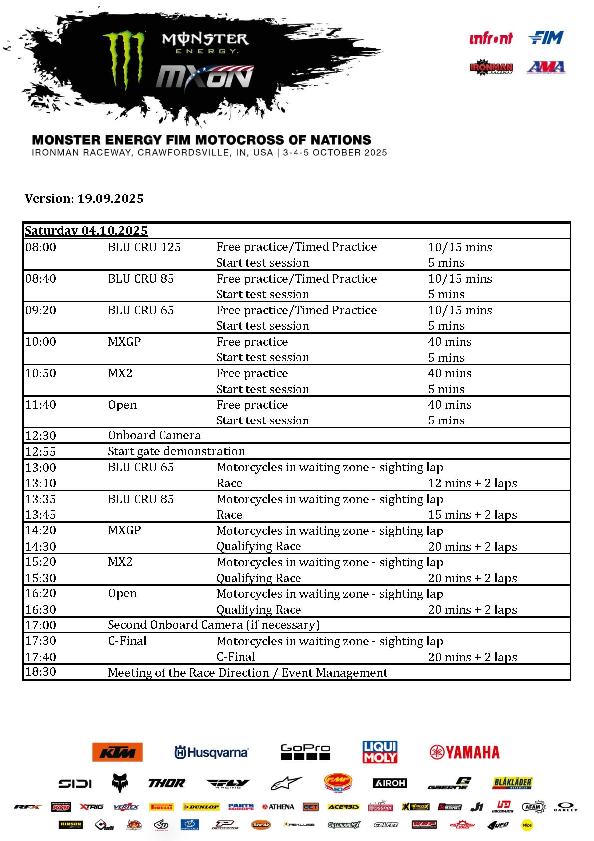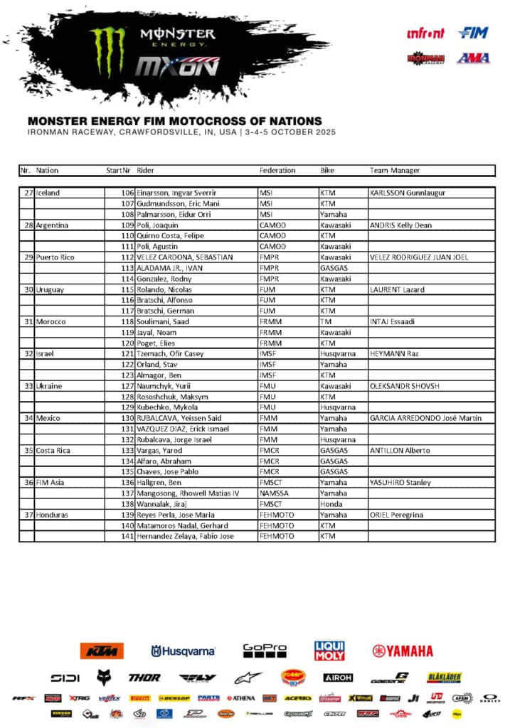 Al deze perikelen samen zorgen in elk geval voor extra spanning als dit weekend 37 landenteams van drie rijders (één MX2-rijder, éen MXGP-rijder en één Open Klasse-rijder) uitkomen op de iconische Ironman Raceway. Bijgaand de officiële deelnemerslijst (bij de USA wordt Deegan dus vervangen door Cooper) en het tijdschema, waarbij er dus zes uur tijdsverschil is en trainingen en wedstrijden in Europa dus ’s avonds zijn te volgen.