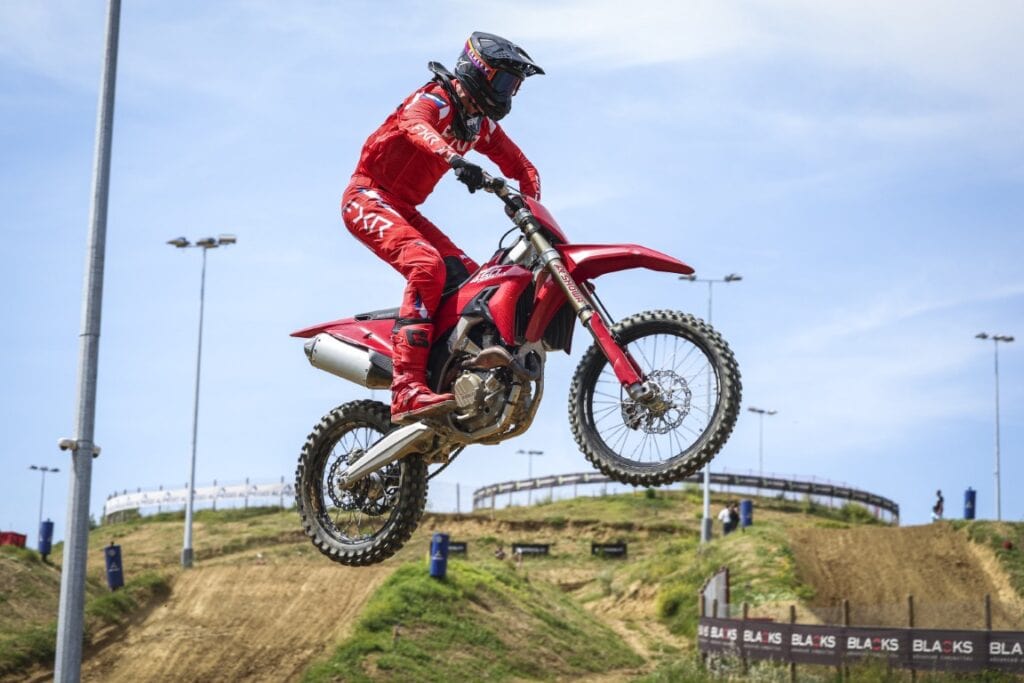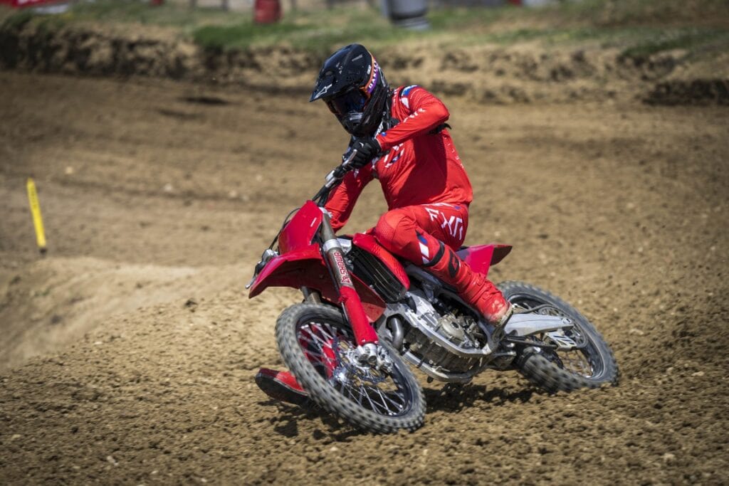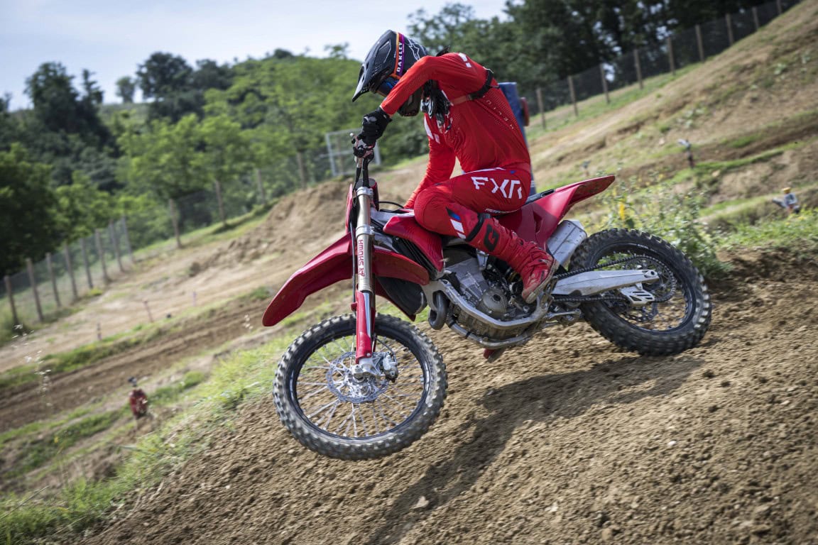 Toen er later op de middag vanwege het stof tussendoor werd gesproeid en het glad werd op de baan bleek ook de traction-control goud waard, want deze Ducati-uitvoering werkt verbluffend goed! Je kunt hem gewoon in de bocht helemaal open zetten zonder dat de motor van achteren wegbreekt op de gladde ondergrond, echt een verschil met andere 450’s. Die hebben vaak relatief simpele systemen, terwijl de Ducati Traction Control (DTC) van de Desmo450MX de vermogensafbouw van de sterke eenpitter op basis van de werkelijke slip van het achterwiel en de massatraagheid van de motor heel effectief bijregelt. Bovendien is het Ducati-systeem in staat om te herkennen wanneer het niet in actie moet komen, zoals bij sprongen.