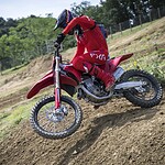 Ondanks de compactheid zit de Desmo450 prima, zelfs voor wat langere rijders. Het stuurmodel is ook perfect, waarbij het stuur door omdraaien en verzetten van de klemmen op vier manieren op de kroonplaat kan worden vastgezet, iets wat we natuurlijk al van meerdere merken kennen. Het is wel opmerkelijk dat de nieuwe Ducati echt vanaf de allereerste meters zo vertrouwd aanvoelt: alsof je de motor al maanden kent. Ook merk je meteen dat hij enorm handelbaar is en superlicht aanvoelt. De motor is perfect in balans en voelt heel neutraal. Vering en de remmen van de Desmo450MX waren onderwerp van een gerichte beslissing: Ducati vertrouwde op zijn lange race-ervaring met Showa en Brembo en die merken zouden ook een rol gaan spelen bij zijn MX-plannen. Wat de vering betreft werd er wel voor gewaakt om niet alleen een afstelling voor de ‘pro’s’ te kiezen, maar juist eentje waarbij ook hobbyrijders zich thuis zouden voelen. Er werd gekozen voor een bekende en volledig instelbare 49-millimeter-Showa-upside-down-vork met 310 millimeter veerweg. Ook de Showa-monoshock achter – veerweg 301 millimeter – is volledig instelbaar. De voorvork spreekt erg goed aan, alleen heeft hij redelijk veel rebound. Achter staat de schokbreker ook prima op hoogte, maar de vork hebben we na eerste sessie toch op de rebound vier klikken verder opengedraaid, wat direct beter aanvoelde. In zijn geheel is de Desmo450 zeker niet te stug afgeveerd. Voor de echt snelle rijders had de machine wellicht wel iets harder mogen aanvoelen.