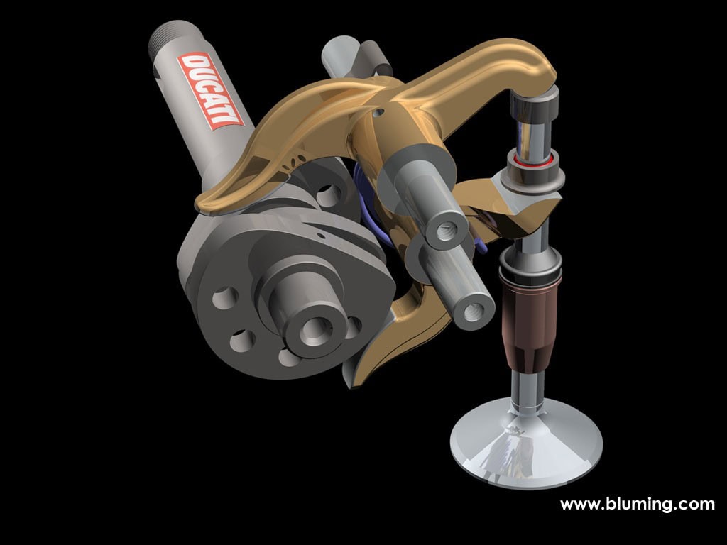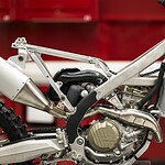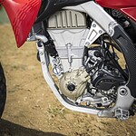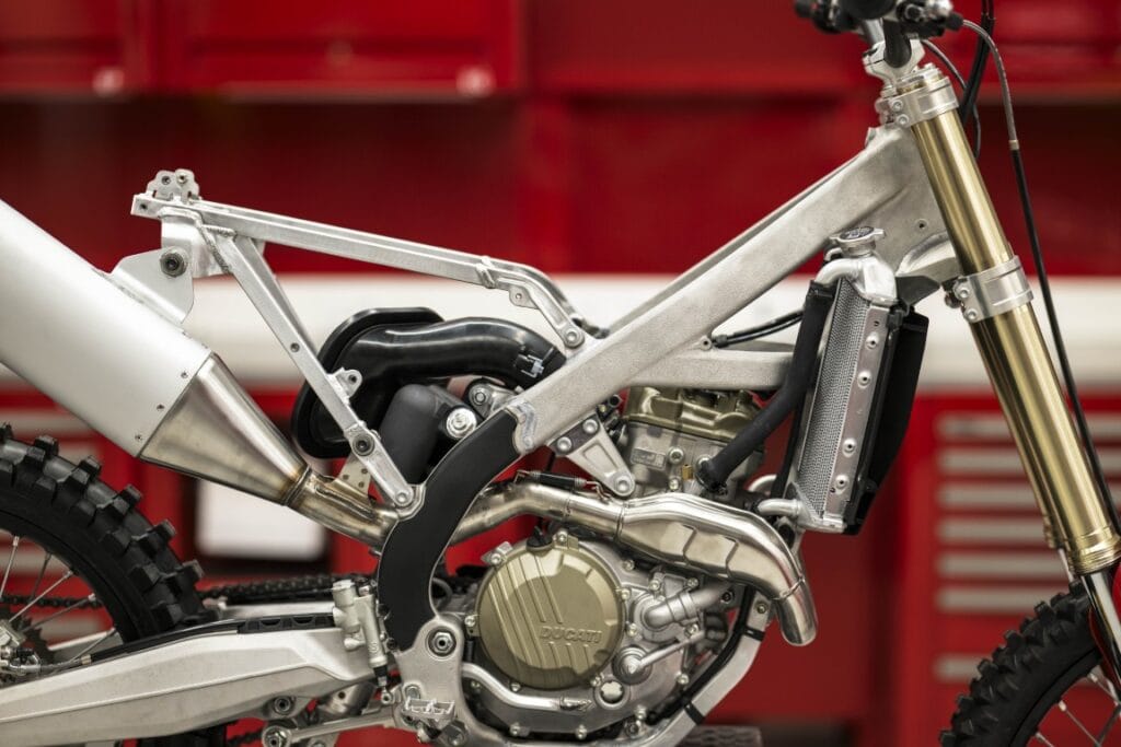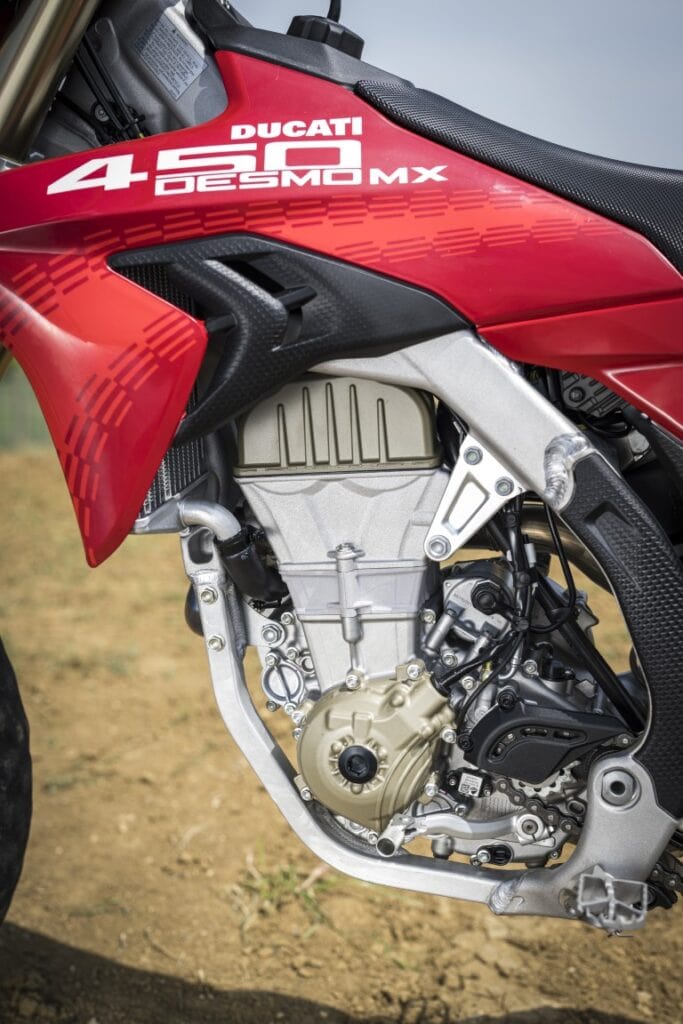 Dee Ducati Desmo450MX is in alle opzichten een totaal nieuwe, eigentijdse machine, niet in de laatste plaats door het unieke motorblok, dat is uitgerust met desmodromische klepbediening. Daarbij worden de twee inlaat- en twee uitlaatkleppen niet zoals gebruikelijk gesloten door een klepveer, maar door een tweede nok en een tuimelaar. De kleppen worden dus niet alleen onder dwang geopend door een nok op een van de twee bovenliggende nokkenassen, maar een tweede nok met precies het tegenovergestelde profiel trekt die klep ook weer onder dwang dicht. Het systeem – zeventig jaar geleden bedacht door de legendarische Ducati-ingenieur Fabio Taglioni – maakte Ducati in de racerij schier onverslaanbaar, omdat met het systeem een heel scherpe kleptiming en hoge toerentallen mogelijk zijn, zonder gevaar voor zwevende kleppen die de zuiger zouden kunnen raken. Bovendien heeft dit systeem als voordeel dat het met minder weerstand werkt en het motorblok dus ‘vrijer’ en zonder vermogensverlies kan draaien, wat juist vooral bij lagere toerentallen merkbaar zou moeten zijn. Voor de sceptici die veel onderhoud vrezen, maakte Ducati ook meteen maar de onderhoudsintervallen bekend: olie en oliefilter elke vijftien uur, zuiger vervangen en klepspelingcontrole elke 45 uur en volledige motorservice elke 90 uur. Dat zijn waardes die niet veel afwijken van die van de reguliere MX-merken.