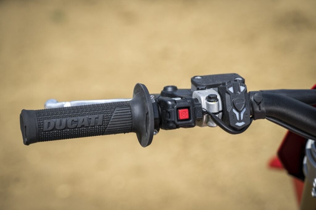 In de racerij is Ducati mede zo toonaangevend door zijn sublieme elektronica en daarvan maakt het ook bij deze crossmotor volop gebruik. Uiteraard kun je links op het stuur kiezen tussen twee rijmodi, die je met de optionele wifi-module en de X-Link-app ook nog eens naar eigen believen kunt aanpassen. In die app zijn ook meerdere rijmodi beschikbaar en kun je bijvoorbeeld ook de mate van motorrem bij het gas afsluiten aanpassen. Het is echter vooral de traction control die aandacht verdient, want hoewel we die al kennen van veel andere merken beweert Ducati dat het dit systeem met zijn wegrace-ervaring naar een nieuw niveau heeft getild. Volgens het merk heeft het zelfs het eerste echte traction control-systeem voor crossmotoren waarbij de werkelijke slip van het achterwiel continu nauwkeurig wordt gemeten en bijgeregeld; het heeft hier zelfs patent op aangevraagd. Het systeem is door de rijder in het zadel in en uit te schakelen en kan bovendien ook even tijdelijk worden ‘overruled’ door een kort tikje tegen het koppelingshendel als je toch even het volle vermogen nodig hebt, bijvoorbeeld in een modderpassage; daarna zal de traction control zich dan weer automatisch inschakelen. Naast deze traction control is er verder ook nog een quickshifter aan boord voor vol gas opschakelen plus een launch-control voor een goede start.