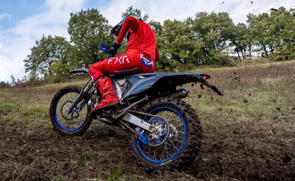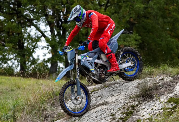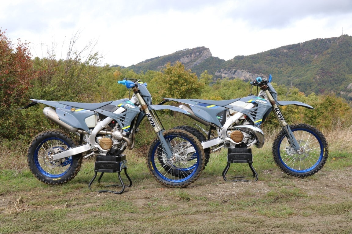 Na ons fabrieksbezoek konden we meteen even twee nieuwe 2026-enduromodellen testen op een prachtig enduroterrein onder de rook van San Marino. TM-testrijder Mirco Serra (in het verleden jarenlang volgrijder van de legendarische enduro-wereldkampioen Mika Ahola) had voor ons een mooi enduro-testparcours uitgezet met verschillende ondergronden, variërend van keienpaden, hellingen en een grasveldje tot een mooi gestoken enduroproef. Voor 2026 kreeg de hele TM-lijn weer een flinke update, en bovendien zijn nu ook de enduro’s leverbaar als de hier geteste Corse-modellen. Deze ‘wedstrijdversies’ zijn standaard rijker uitgerust en voorzien van talloze extra’s. Verder kregen de TM’s naast een nieuw uiterlijk ook aangepaste vering, nieuwe voetsteunen, verbeterde motormappings en een compleet nieuwe koppeling, die op de Corse-modellen ook niet langer werkt met zes spiraalveertjes, maar met één diafragma-veerplaat. De nieuwe HGS-uitlaat op de 300-viertakt heeft in tegenstelling tot het oude model geen dubbele einddemper meer, maar nog maar één einddemper rechts. Dat draagt volgens de fabriek bij aan een meer lineaire vermogensafgifte. Ook is de elektrische starter verbeterd. Bij de 300-tweetakt-enduro is verder vooral gewerkt aan de verbeterde injectie, onder meer door een andere hoek van de injector en een aangepaste mapping.