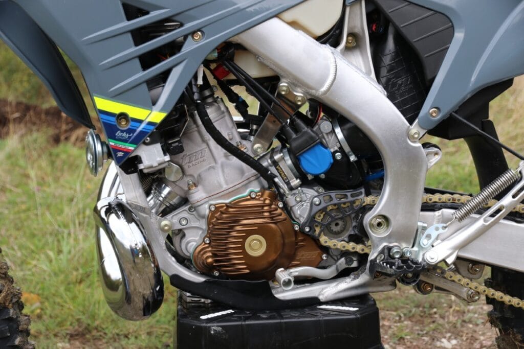 Het 300-viertaktblok van TM is echt een verhaal apart. Dat is zeker geen dertien-in-een-dozijn-blok, maar een uiterst slim geconstrueerd stukje toptechniek. Het blok komt via een boring en slag van 81 x 58,1 millimeter aan een inhoud van 299,4 cc. Hij is er trouwens ook als 250, met een boring en slag van 77 x 53,6 millimeter. De vier kleppen worden bediend door twee bovenliggende nokkenassen, die worden aangedreven vanaf de krukas via een korte ketting en een hoogliggend tussentandwiel. Een fraaie constructie, waardoor de cilinderkop zelf mooi compact kon blijven. TM ontwikkelde deze constructie voor de racerij, omdat het mee wilde gaan doen in het Moto3-kampioenschap in de GP’s, maar werd uiteindelijk van de circuits werd geweerd omdat het reglementair niet genoeg motoren en motorblokken produceerde. Gelukkig kon die technische basis worden doorontwikkeld tot dit enduro- en cross-motorblok. Het blok voelt met name onderin eigenlijk meer aan als een 450 dan als een 250. Je kunt hem echt op toeren rijden en heel ver doortrekken, maar dat hoeft niet, want ook onderin praat hij al echt tegen je en merk je dat er goed vermogen in zit. Halverwege vlakt het dan heel iets af, om meteen daarna weer stevig door te trekken en juist als een 250 naar dik 10.000 toeren te vliegen. Echt opmerkelijk, die prestaties van dit kleine blok!