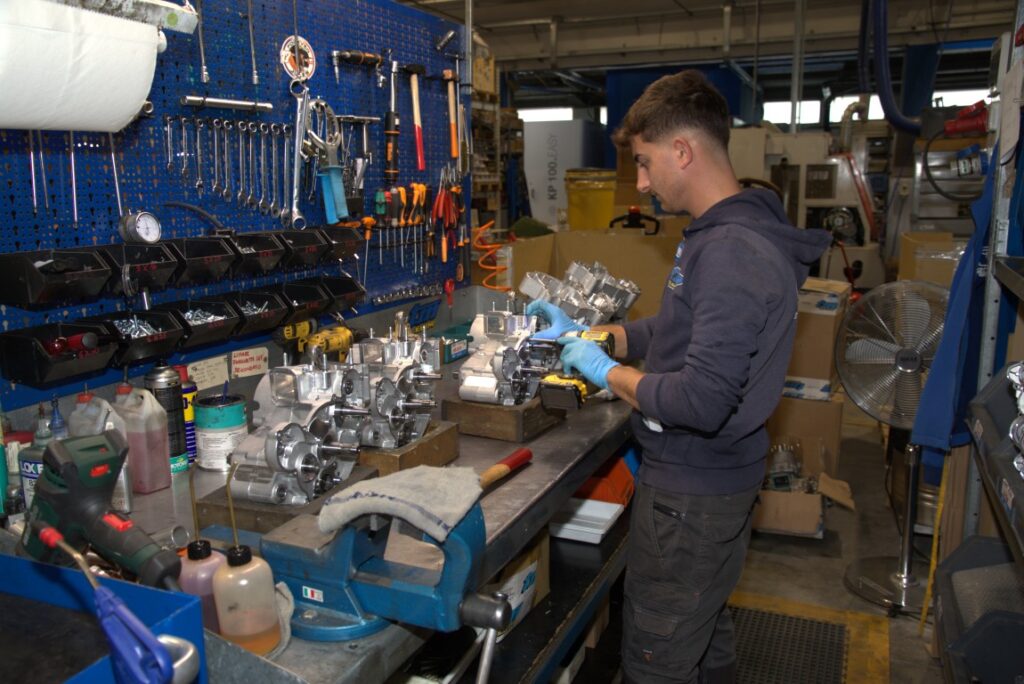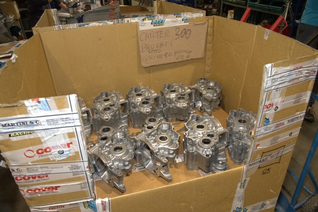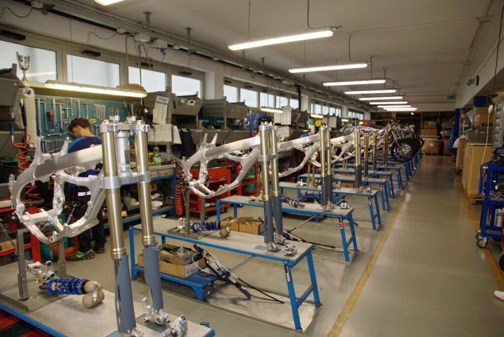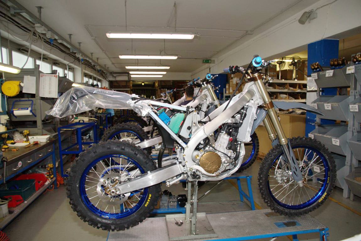 De kleine 2.000 motoren die jaarlijks deze fabriek uitrollen, zijn dus stuk voor stuk met de hand opgebouwd. Dat begint bij het motorblok, waarbij elke tweetaktcilinder en elke viertakt-cilinderkop liefdevol wordt nabewerkt, om vervolgens door één werknemer in een serie van vijf stuks zonder stress te worden opgebouwd tot een compleet motorblok. Daarna komt zo’n motorblok dan terecht in een rijwielgedeelte dat ook door één werknemer van de grond af aan wordt opgebouwd op een hefbrug. Natuurlijk is er goed nagedacht over de productie, maar het is niet alleen opmerkelijk hoeveel onderdelen TM in eigen huis produceert, maar ook welke rust er in de fabriek heerst bij het produceren van alle onderdelen en het samenvoegen van die delen tot een complete motor. Het hele productieproces staat daarmee haaks op de uitgekiende massaproductielijnen en lopende banden met robots zoals we die kennen van de grote merken. Eigenlijk is elke TM daarmee een soort fabrieksmotor, die helemaal met de hand is opgebouwd.