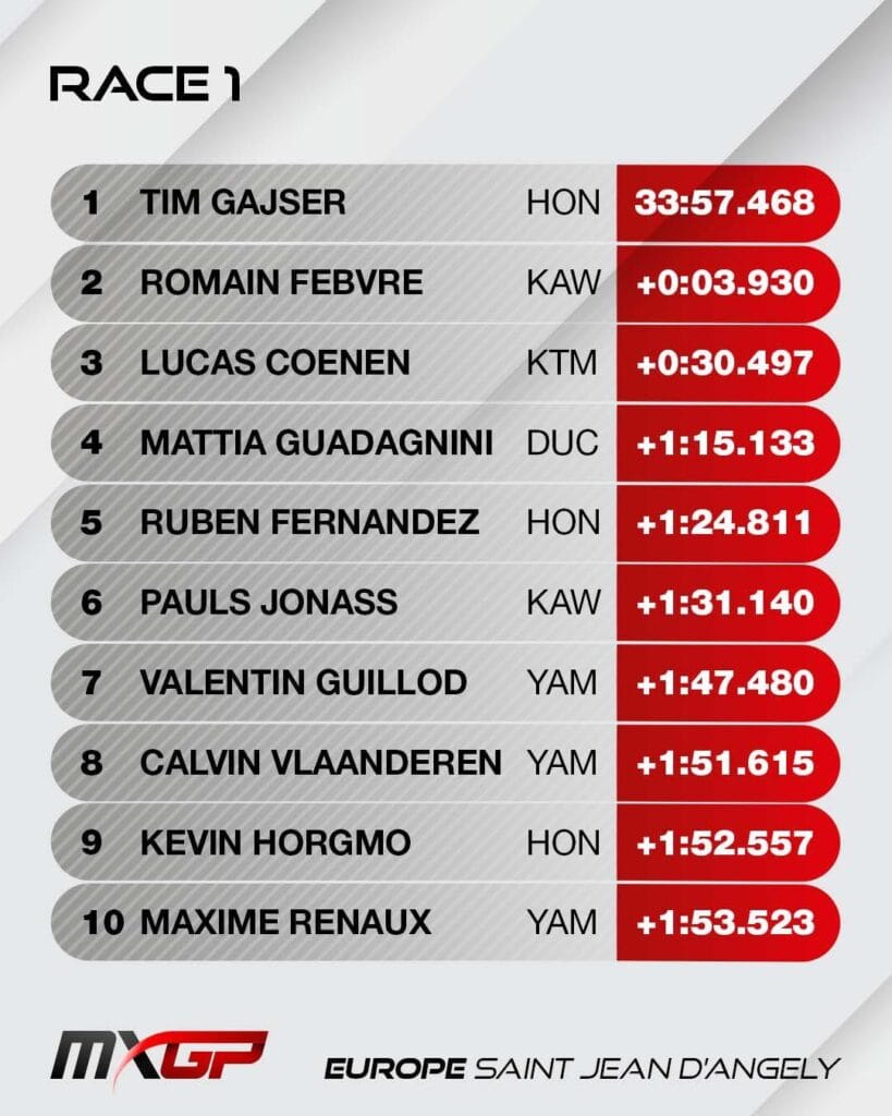 Tim Gajser is in topvorm, en won na de modderige Spaanse GP ook de MXGP in het Franse St. Jean d’Angely gecontroleerd met twee manchewinsten. In de tweede manche moest hij daarvoor wel snelstarter Glenn Coldenhoff van de leiding verdringen. Coldenhoff werd nu vierde, en was de eerste manche na een matige start elfde geworden, net voor teammaat Brian Bogers.