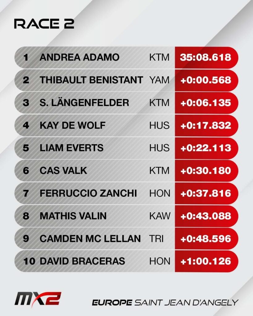 Romain Febvre sloot de GP af als tweede overall (2×2) voor kwalificatie-winnaar Lucas Coenen (2 x 3). In de WK-stand staat Gajser ook stevig aan de leiding met al 29 punten voorsprong op Febvre. In de MX2 ging de GP-winst verrassend naar de Italiaan Andrea Adamo, de 2023-wereldkampioen die afgelopen jaar vrijwel onzichtbaar was. Adamo werd in twee erg spannende races tweede en eerste. KTM-teammaat Simon Langenfelder werd overal tweede (1+3) en Thibault Benistant derde (5+2).