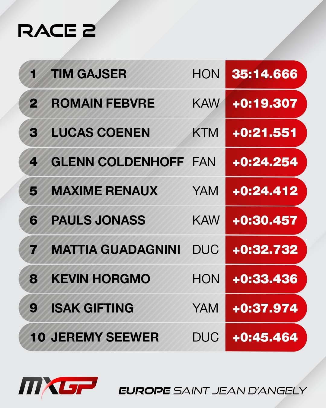 Romain Febvre sloot de GP af als tweede overall (2×2) voor kwalificatie-winnaar Lucas Coenen (2 x 3). In de WK-stand staat Gajser ook stevig aan de leiding met al 29 punten voorsprong op Febvre. In de MX2 ging de GP-winst verrassend naar de Italiaan Andrea Adamo, de 2023-wereldkampioen die afgelopen jaar vrijwel onzichtbaar was. Adamo werd in twee erg spannende races tweede en eerste. KTM-teammaat Simon Langenfelder werd overal tweede (1+3) en Thibault Benistant derde (5+2).