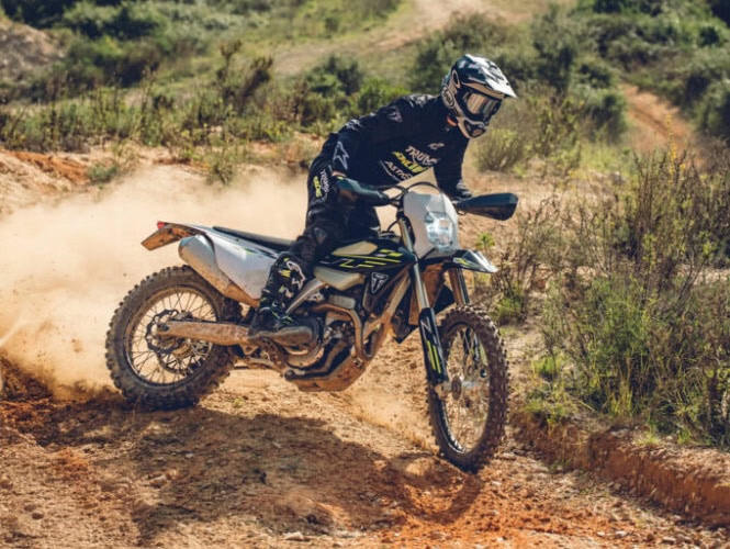 De 450 levert 58,6 pk en 49,3 Nm. Deze weegt met volle 8.3 liter tank 116,7 kilo. Als prijzen worden op de Nederlandse website vermeldt € 11.795,- voor de 250 enduro en € 12.395,- voor de 450 enduro, maar we vermoeden dat dit gezien het kleine verschil met de prijzen voor de Triumph crossmotoren verkoopprijzen zijn zonder BPM en kentekenregistratie. De prijzen lijken daarmee all-in net iets onder de prijzen van KTM enduro’s terecht te komen.